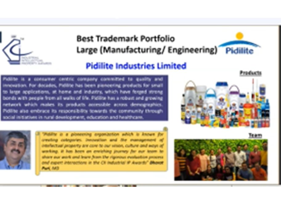 Pidilite Industries Limited won the award in the Category of Best Trademark Portfolio, Large (Manufacturing/ Engineering)
