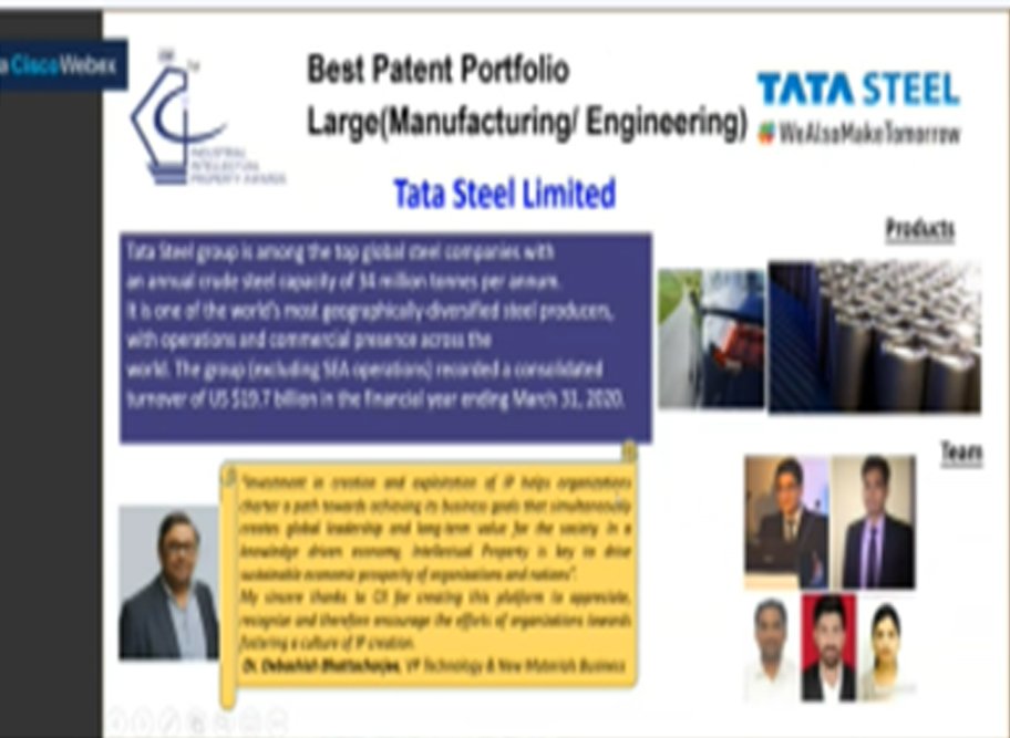 Tata Steel Limited won the award in the Category of Best Patent Portfolio, Large(Manufacturing/ Engineering)