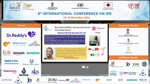 Niramai Health Analytix Pvt Ltd won the award in the category of Best Patent Portfolio, Startup- Life Sciences (Pharma and Agriculture sciences)
